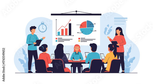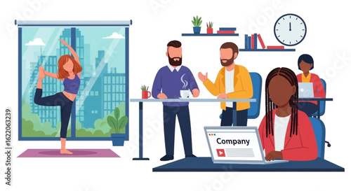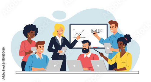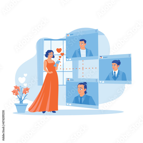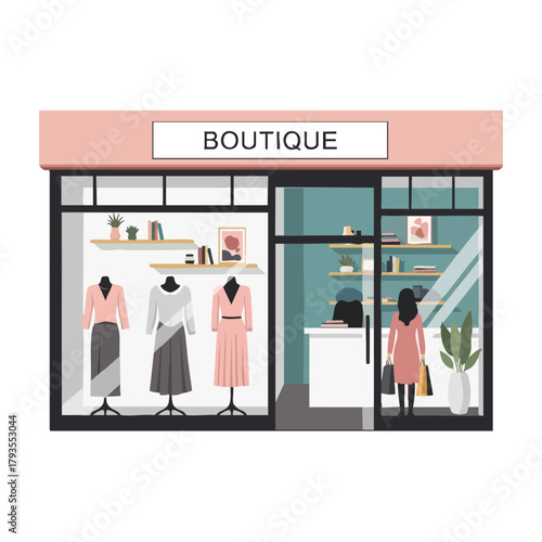 Mladá žena se snaží na bílé šaty před zrcadlem v módním butiku, prodavačka navrhuje ještě jeden krásný zelené šaty, vektorové ploché ilustrace. Žena obchod, krása a módní koncept.