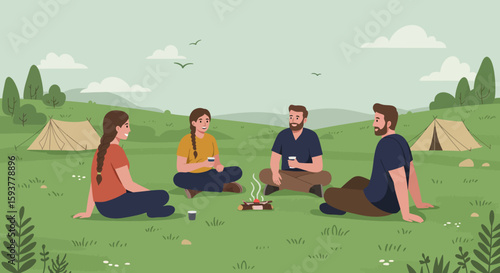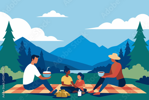 Žena sedí na dece a čtení knihy s horskou krajinou na pozadí. Letní venkovní piknik koncept ilustrace. Vektor web design šablony. Víkend a dovolená, venkovní cestování.