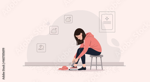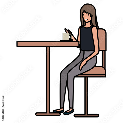 Žena sedí u stolu stůl zpět pohled vektorové ikony izolovaných na bílém pozadí