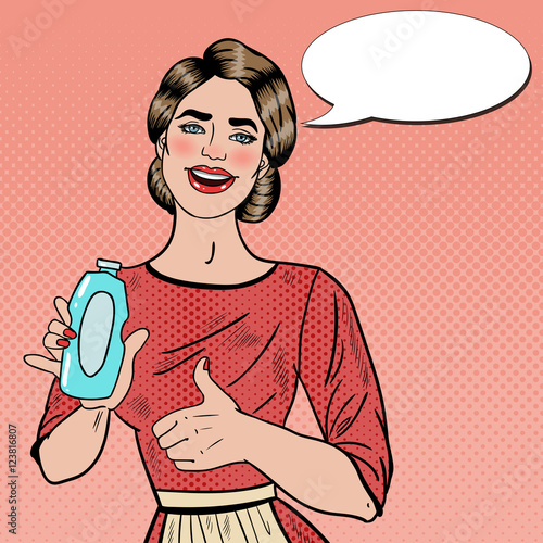 Žena se usmívá a ukazuje OK ruční znamení s řečovou bublinou. Vektorová ilustrace v retro komiksovém pop art stylu. Fitness dívka v dobré kondici s lahví vody.