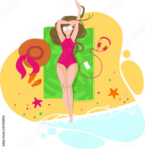 Žena fotografuje ryby pod vodou. Dívka fotí krásný západ slunce a loď. Cestování a letní dovolená na pláži koncept ilustrace. Vektor web design šablony.