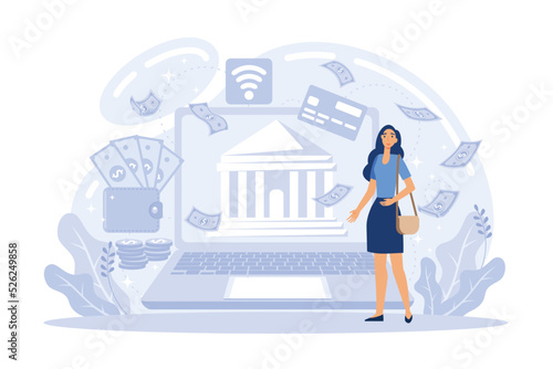 Žena cestovatel charakter s taškou na kufr výběru přemístění cíle. Imigrační scéna vektorové ilustrace. Planeta s geolokačními kolíky, peníze v hotovosti, místo určení a nový domov