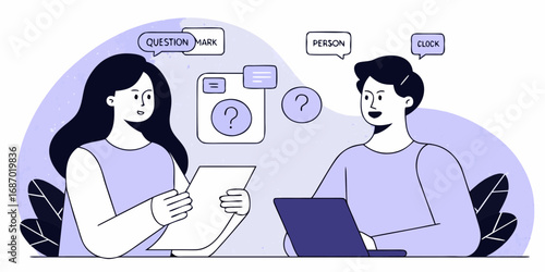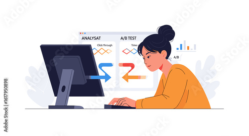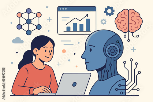 Žena pomocí neuronové sítě ploché kreslené vektorové ilustrace. Futuristická technologie umělé inteligence a obchodní koncept