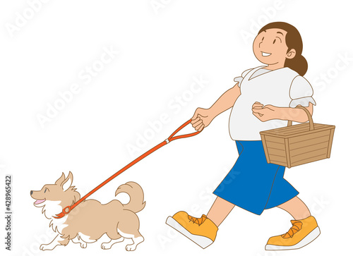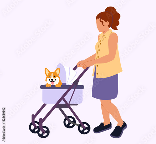 Žena venčení psa a vyzvednutí pet odpadu vektorové ilustrace. Ženská postava házení psí hovínko ve speciálním sáčku do koše izolovaných na bílém pozadí