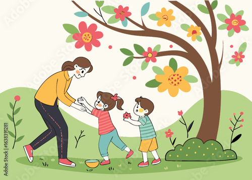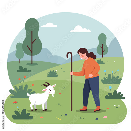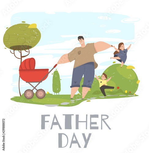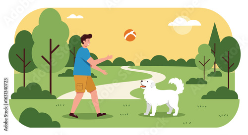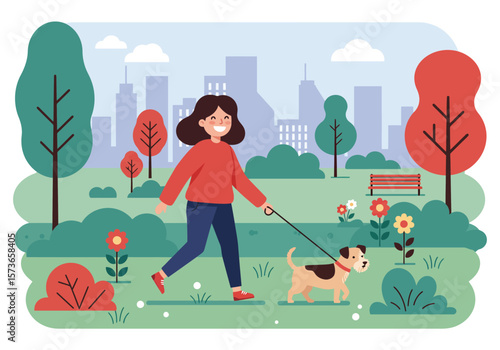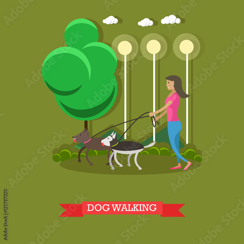 Žena chodí se psy v parku. Vektorový plakát.
