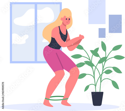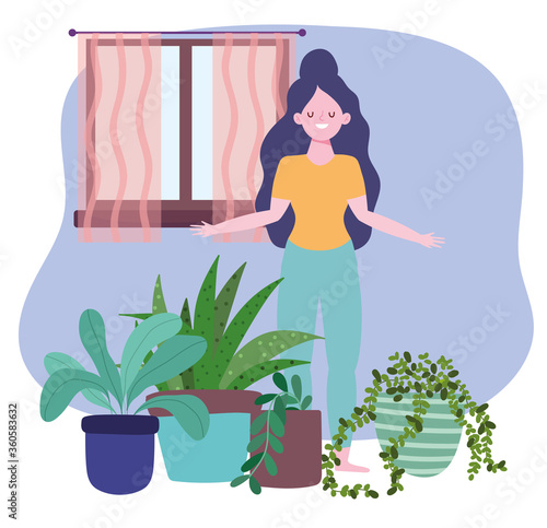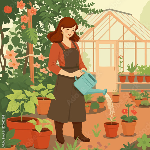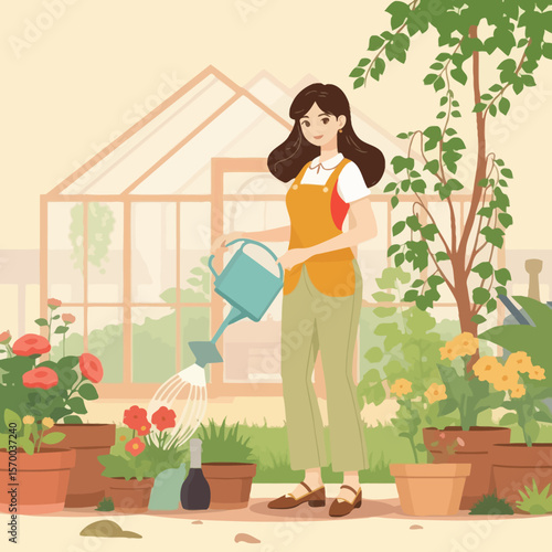 Mladá žena zalévání květin na balkoně. Vektorové ilustrace v plochém stylu. Květinové zahradnictví hobby koncept designový prvek.