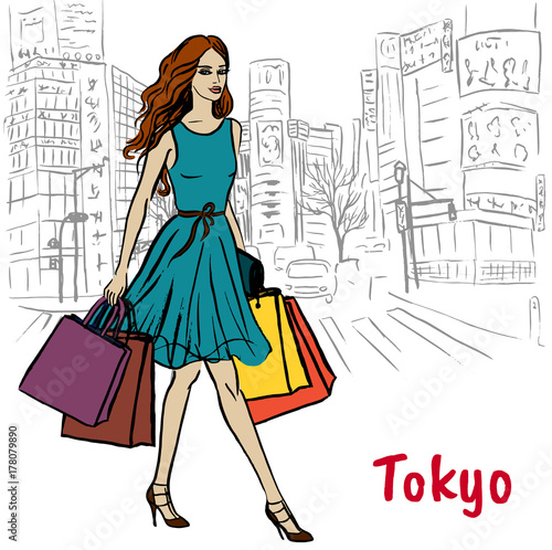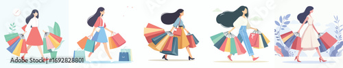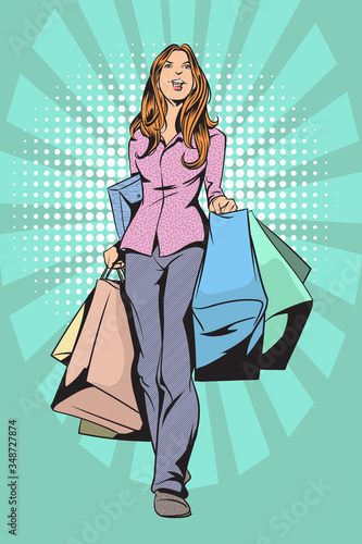 Žena s taškami nakupování. Vektorová ilustrace v komiksovém pop art stylu. Speciální prodej nabízí reklamní plakát.