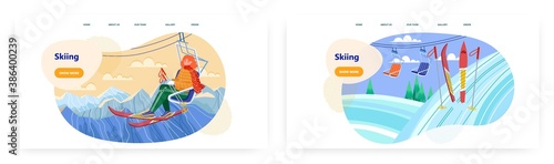 Žena s lyžemi sedí na sedačkové lanovce. Zimní dovolená na horském lyžařském středisku vector concept ilustrace. Lyžování sport. Sněhová Hora Zimní krajina. Šablona návrhu webových stránek.