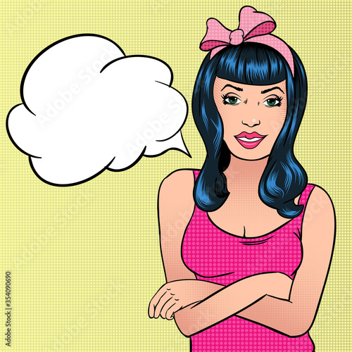 Žena s řečovou bublinou ve stylu retro pop art. Komiksová vektorová ilustrace.