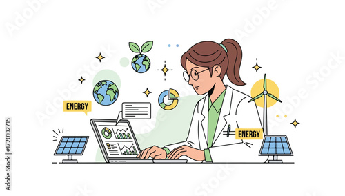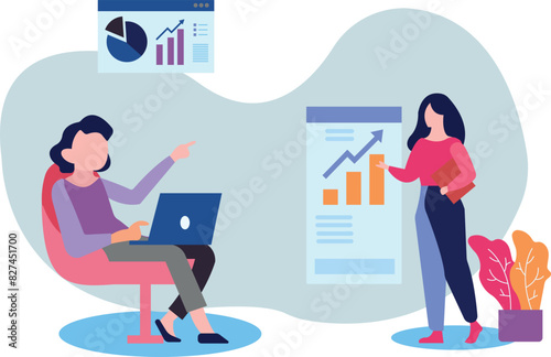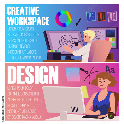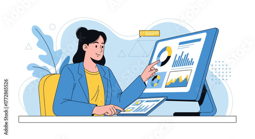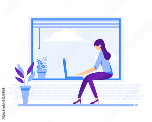 Žena pracuje s notebookem doma nebo v kanceláři. Blog obsah a home office koncept ilustrace. Vektor web design šablony. Novinář na volné noze píše obsah.