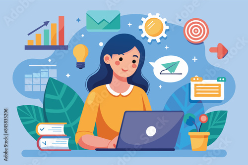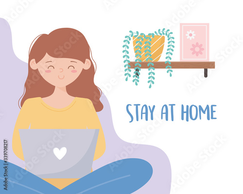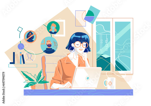 Žena pracuje s notebookem v domácí kanceláři. Obchodní koncepce ilustrace. Vektor web design šablony. Otevřete notebook a kávu na stole.