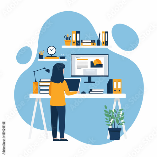 Žena psaní storytelling scénář na domácí kancelář vektor. Copywriter freelancer pracuje na počítači na pracovišti ilustrace. Kreativní spisovatel podnikatel na volné noze workspace