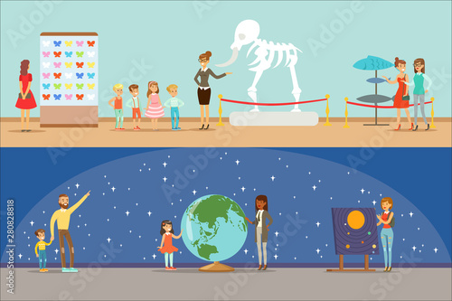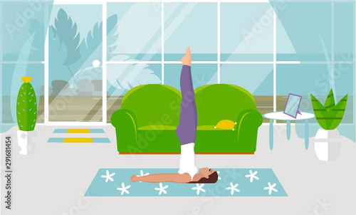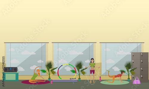 Ženy dělají cvičení a jógu ve fitness centru. Tělocvična interiér vektorové ilustrace. Žena fitness bannery.