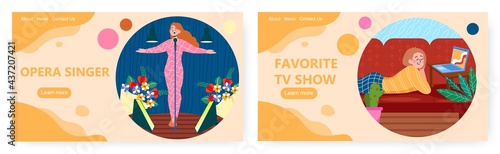 Ženy oblíbené aktivity, design vstupní stránky, sada šablon webových stránek, plochá vektorová ilustrace. Ženské postavy se těší oblíbené televizní show doma, operní pěvkyně vystupující na divadelní scéně.