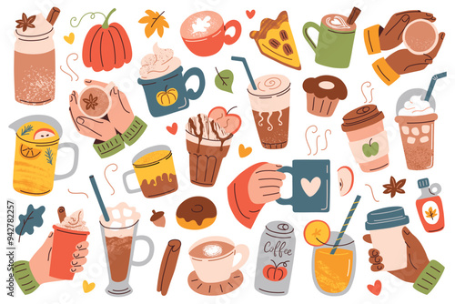 Ženy ruce drží čajové šálky a hrnky na kávu, ploché vektorové izolované ilustrace. Teplé nápoje na zahřátí.