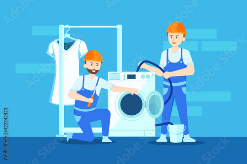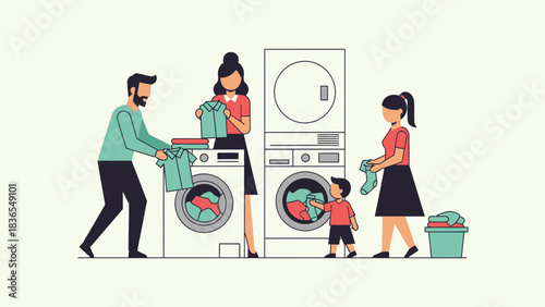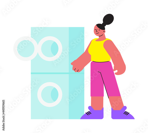 Ženy prát prádlo v pračce. Vektorové ilustrace v plochém stylu.