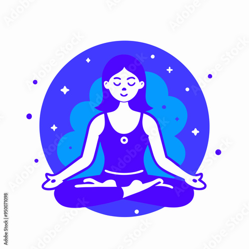 Mladá žena medituje, relaxační sezení v lotosové jógové pozici, Yin yang symbol v ruce, vektorový plochý designový obrázek. Studio jógy, wellness, lázeňské služby.
