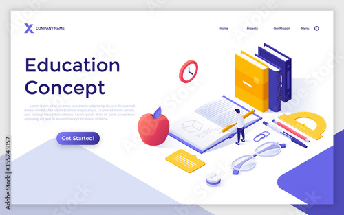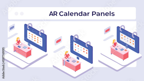 Pracovní den, návrh vstupní stránky, šablona banneru webových stránek, izometrická ilustrace plochého vektoru. Plán plánování, Správa úkolů, připomenutí, časový rozvrh.