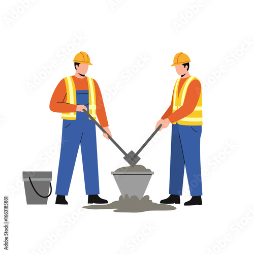 Dělník builder v jednotném míchání cementu vektorové ilustrace izolovaných na bílém pozadí. Stavební dělník pomocí mixéru, aby se dlaždice mix. Koncept obkladů master at work