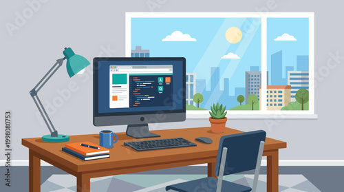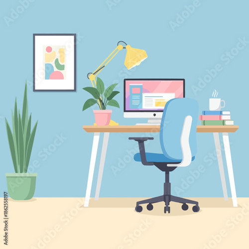 Pracoviště na letní tropical beach vektorové šablony plakátu. Přenosný počítač, koktejl pina colada, fotoaparát, sluneční brýle na stole pod slunečníkem. Na volné noze, vzdálené pracovní místo, plochý design.