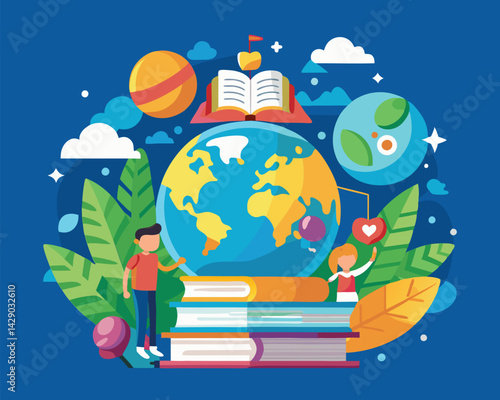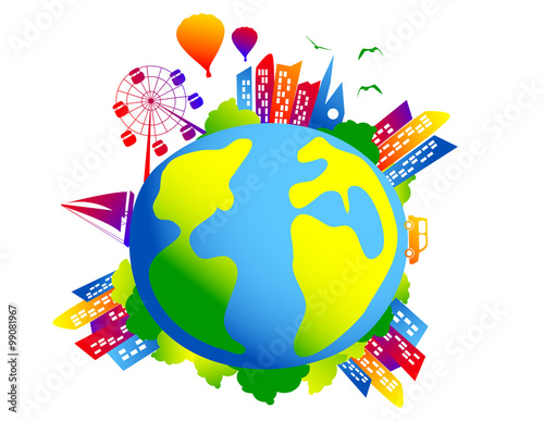Světové cestování autem, vektorové ilustrace ve stylu papírového umění. Šťastná rodina se dvěma dětmi cestujícími autem, světově proslulé památky. Rodinný výlet, celosvětové turné, letní dovolená.