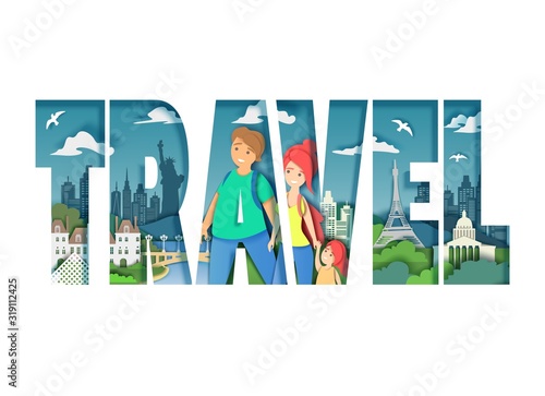 Cestovní slovo velkými písmeny se šťastnou rodinou, která se těší návštěvě slavných atrakcí v New Yorku a Paříži, vektorové ilustrace ve stylu papírového umění. Složení světového cestovního ruchu pro plakát, banner atd.