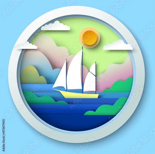 Yacht cruise na tropic resort papercut pozadí šablony. Letní dovolená Cestovní reklamní plakát s plachetnicí v moři oceánu vodní vlny