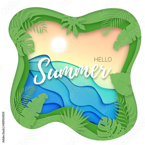 Jachta výletní papír střih styl vektorové ilustrace. Plachetnice loď cestování origami pozadí. Design tropické krajiny. Aktivní turistika a Kummer dovolená v resortu