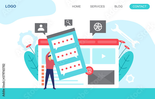 Jóga blogger vstupní stránky design, webové stránky banner šablony set, ploché vektorové ilustrace. Žena trenér vlogger nahrávání videa jógy s smartphone fotoaparát na stativu. Blog nebo živé vysílání.