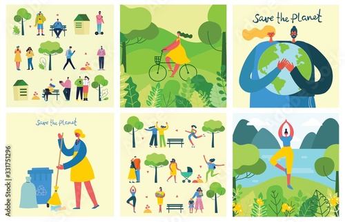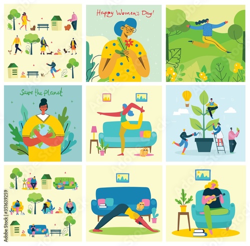 Mladá dívka s selfie před zrcadlem. Instant photo camera vektorové plakáty set. Fotografie z rande romantického páru. Ruka drží fotografie s krajinou lanscape na pozadí.