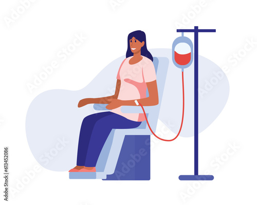 Mladá šťastná žena darování krve vektorové ikony izolovaných na bílém pozadí.