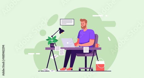 Mladý muž ve sluchátkách mluví do mikrofonu před přenosným počítačem, ploché vektorové ilustrace. Dj vytváří podcast, hostování živé rozhlasové show ve studiu. Podcasting, online rozhlasová stanice.