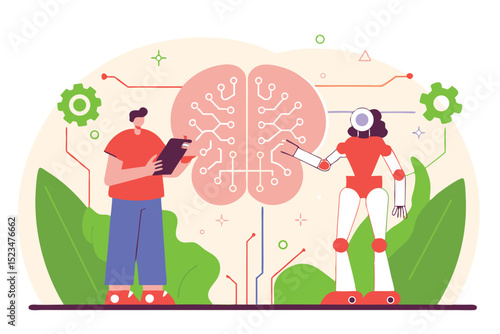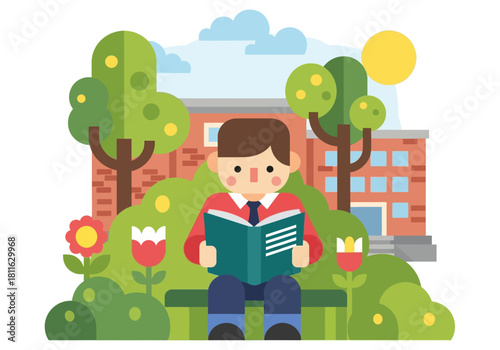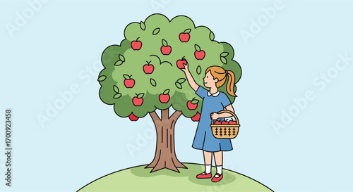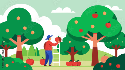 Mladý muž, zahradník nebo farmář sbírání zralých červených jablek z ovocného stromu v zahradě, ploché vektorové ilustrace. Zahradnictví, zemědělství, sezóna sklizně jablek.