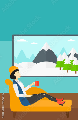 Mladý muž v VR brýle rafting na virtuální nafukovací člun, zatímco sedí v křesle doma, ploché vektorové izolované ilustrace. Technologie virtuální reality.