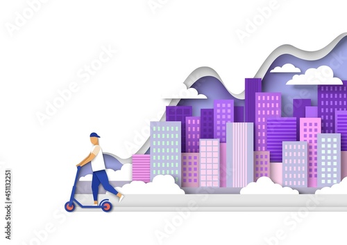 Mladý muž na koni elektrický koloběžka na silnici, vektorové ilustrace v papírové umění stylu. Moderní vozidlo, ekologická městská doprava. Jízda na pouličním skútru.