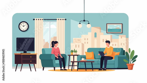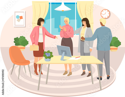 Mladý muž posílá květiny online pro svou přítelkyni, plochá vektorová ilustrace. Šťastná žena se těší kytici krásných květin sedí u stolu s notebookem. Online dárky a květiny doručovací služba.
