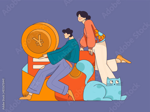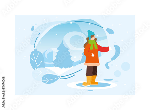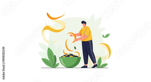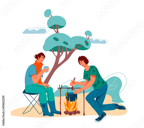 Mladý muž zpívá a hraje na akustickou kytaru u táboráku. Camping a akustika koncepce šablony. Vektorová ilustrace v plochém provedení.