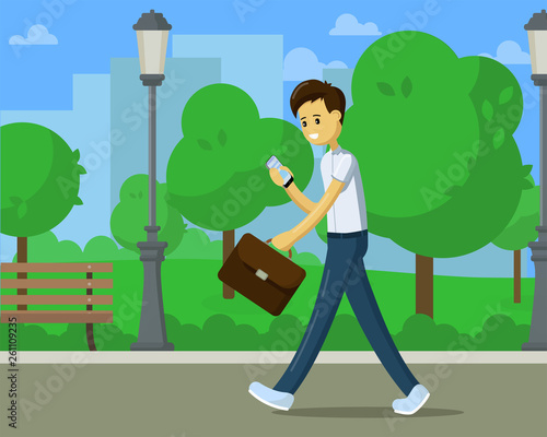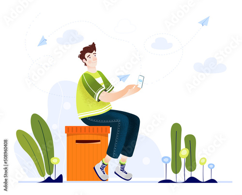 Mladý muž, Popelář, pouliční čistič sbírající odpadky, házení plastové láhve do pytle na odpadky, ploché vektorové ilustrace. Úklidové služby.