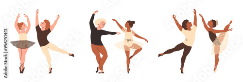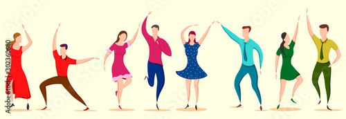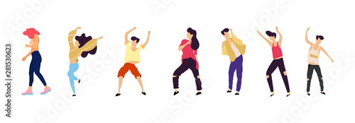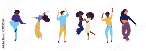 Mladí lidé kreslené postavičky tančí loučení izolované set. Šťastný pozitivní muž a žena pohybující se na hudbu třesoucí se tělo pocit zábavy a vzrušený vektorové ilustrace