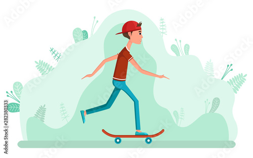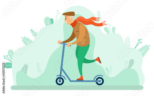 Lidé na koni skútr ploché vektorové ilustrace. Mladý muž a žena pár pomocí ekologické dopravy. Šťastný aktivní chlap a dívka si letní zábavu čas volnočasové aktivity