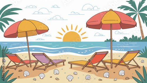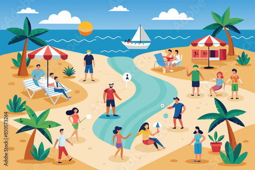 Mladí lidé, rodina odpočívá na pláži se těší dobrodružství na přírodu a aktivní vodní sport vektorové ilustrace. Tropická krajina na pobřeží se šťastnými postavami během letních prázdnin