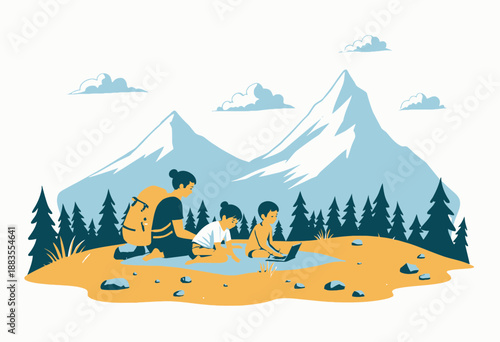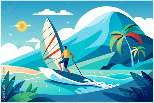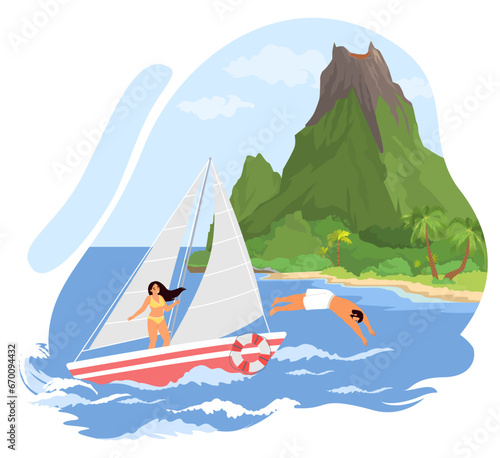 Mladí lidé, mužský a ženský pár jachting společně poblíž tropické přímořské vektorové ilustrace. Vodní dobrodružství, vodní extrémní sportovní aktivity během letních prázdnin