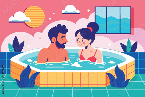 Mladí pozitivní lidé, kteří se koupají termální procedura na saunové scéně. Uvolněná skupina přátel v dřevěném bazénu se těší Rekreaci volný čas a pěkné komunikace vektorové ilustrace