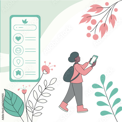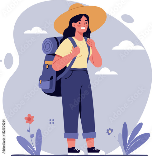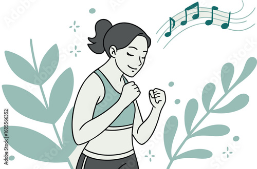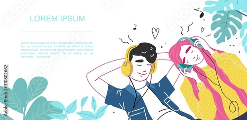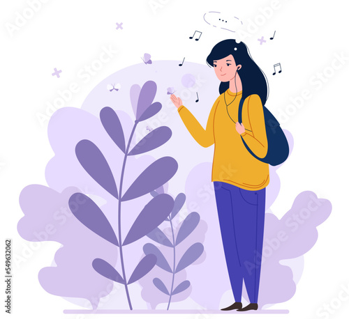 Mladá hezká dívka poslech hudby se těší krásu přírody vektorové ilustrace izolovaných na bílém pozadí. Inspirace, koncept snění