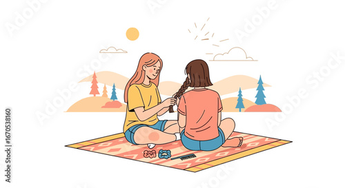 Mladá žena přátelé baví, klábosení, pití alkoholických nápojů doma pyžama party před sňatkem vektorové ilustrace. Interiér pokoje zdobený vlajkovou girlandou a svatební šaty v rohu