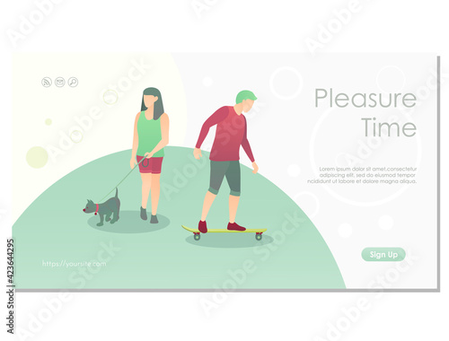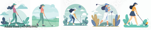 Mladá žena, zahradník sekání trávy sekačkou na trávu, ploché vektorové ilustrace. Zahradnictví, zemědělství, péče o zahradu a údržba.