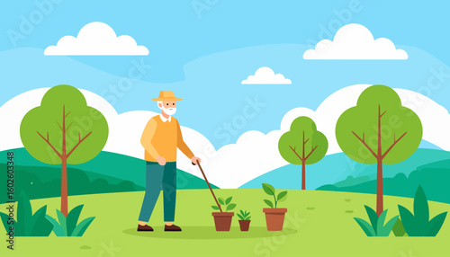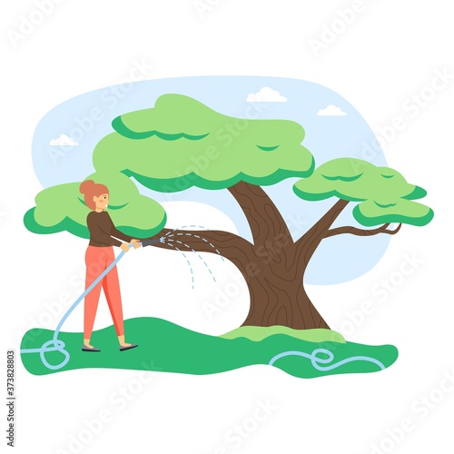 Mladá žena, zahradník zalévání strom s vodní hadicí, ploché vektorové ilustrace. Zahradnictví, zemědělství, péče o zahradu a údržba.