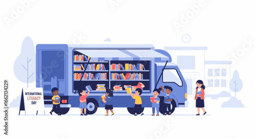 Autobus. Mladá žena pomáhá postiženému muži sedícímu na invalidním vozíku nastoupit do městské hromadné dopravy pomocí rampy pro bezbariérový přístup, plochá vektorová ilustrace. Životní styl osoby se zdravotním postižením. Autobusová dostupnost.