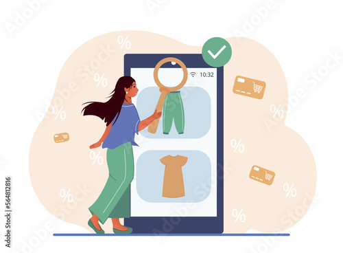 Mladá brunetka žena v červených šatech výběru moderní kabelku před zrcadlem v módním butiku, ploché vektorové ilustrace. Ženy obchod, krása a módní koncept.