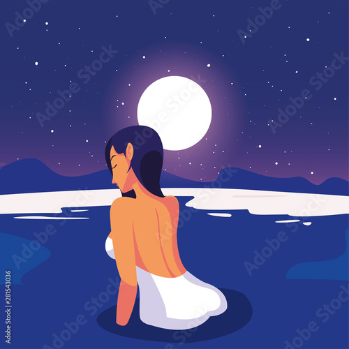 Zasněná uvolněná mladá žena zabalená do deky sedící na parapetu při pohledu přes sklo do noční hvězdné oblohy odpočívá doma byt vektorové ilustrace
